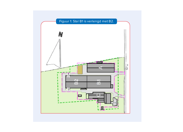 De plannen voor meer vleeskuikens waren er al in 2013. De familie heeft toen een aanvraag ingediend voor de Wet natuurbescherming. Die vergunning is in 2015 ook verleend, maar omdat de opvolging nog onzeker was, zijn de plannen op de lange baan geschoven. Totdat in de 2018 de bedrijfsopvolging zich meldde; zoon Dirk. De plannen om de bestaande stal te verlengen werden uit de kast gehaald en er werd een vergunning aangevraagd en verleend voor de verlenging van de stal B1 (figuur 1).