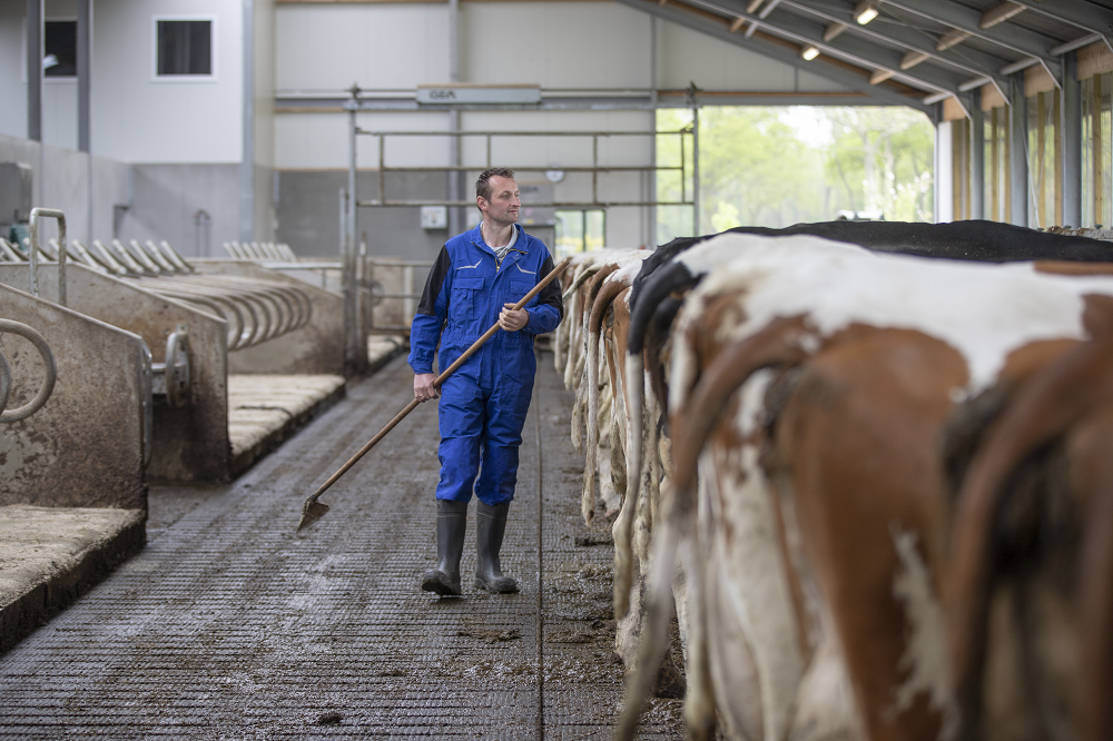 Er kon geen koe meer bij. “Toen stonden wij voor de keus: stoppen of investeren in een nieuwe stal. Wij zijn melkveehouders in hart en nieren en dus kozen we natuurlijk voor het laatste, van een grupstal naar een ligboxenstal. In oktober 2019 is de aannemer begonnen met de bouw en in maart 2020 is deze in gebruik genomen. We werken nu ruim een jaar in deze stal en hebben er geen moment spijt van gehad.” Hij toont de melkstal, die er nieuw uitziet, maar is overgenomen van een melkveehouder die met zijn bedrijf is gestopt. De melkstal was slechts enkele jaren in gebruik geweest. “Dat scheelde mij de helft van de kosten. In mijn oude stal liep ik met vijf melkstellen achter de koeien langs. Daar was ik elke melkbeurt twee uur mee bezig. Nu ben ik in één uur klaar en kan ik bijvoorbeeld samen met mijn gezin ontbijten. Dat lukte mij in het verleden nooit.”