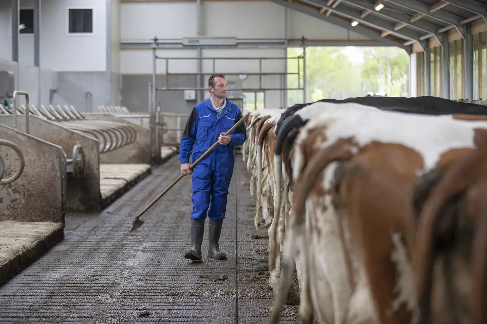 Hij praat liever over zijn nieuwe stal. Bijvoorbeeld over de emissiearme vloer met een rubberen toplaag en kleppen tussen de vloerdelen om de urine snel af te voeren. “Volgens de geleerde heren komt er minder ammoniak vrij. Prima, maar voor de koeien is het rubber belangrijker. Deze vloer is goed voor hun klauwen, de grip is super. Ik heb nog nooit een koe zien uitglijden.”
