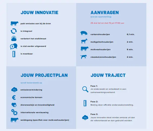 De innovatiemodule is opengesteld voor de melkvee-, vleeskalveren-, varkens-, en melkgeitenhouderij. De module bestaat uit verschillende fases en is opgezet om nieuwe ideeën te onderzoeken, te ontwikkelen en te testen. Om in aanmerking te komen voor de subsidie moet er worden voldaan aan minimale voorwaarden en eisen. De aanvraag wordt beoordeeld door middel van verschillende criteria. De eerste openingsronde is gestart op 25 mei 2020 en loopt tot en met 15 juli 2020 17:00 uur. Gedurende deze periode kan een aanvraag worden ingediend. In het najaar zal een tweede openingsronde worden gestart en tot 2024 zullen deze inschrijfrondes twee keer per jaar terugkomen. In totaal is er een budget van 172 miljoen euro vrijgemaakt. Dit zal over de verschillende rondes en sectoren worden verdeeld.