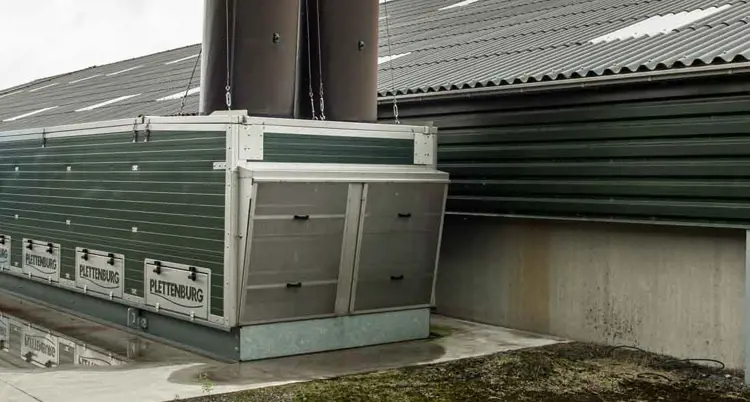 - Warmtewisselaar waarbij de stof wordt opgevangen in een opvangbak voordat de stallucht in de wisselaar komt. De opvangbak dient regelmatig te worden geleegd.