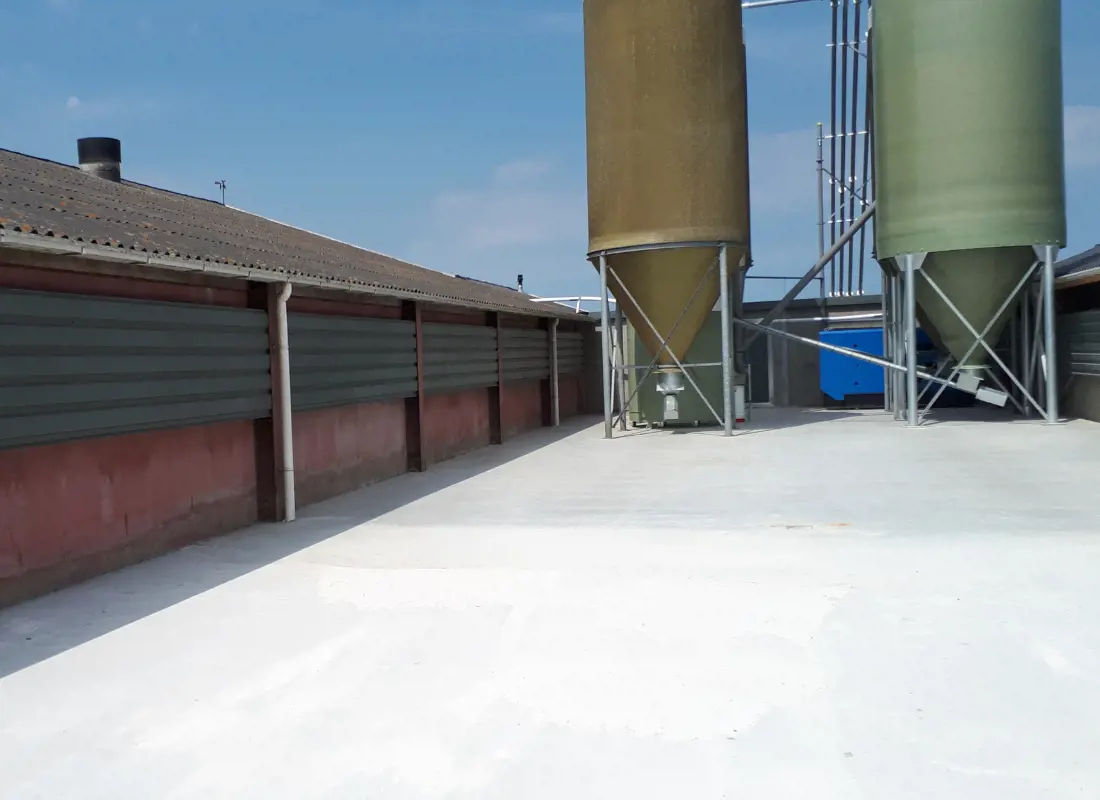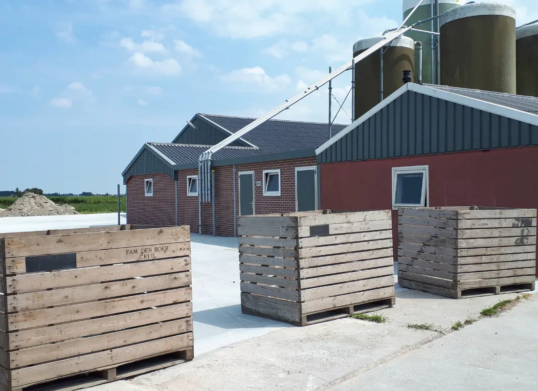 - Een overzichtelijke opstelling van de voersilo's met aansluitingen van de vulpijpen aan de voorgevel